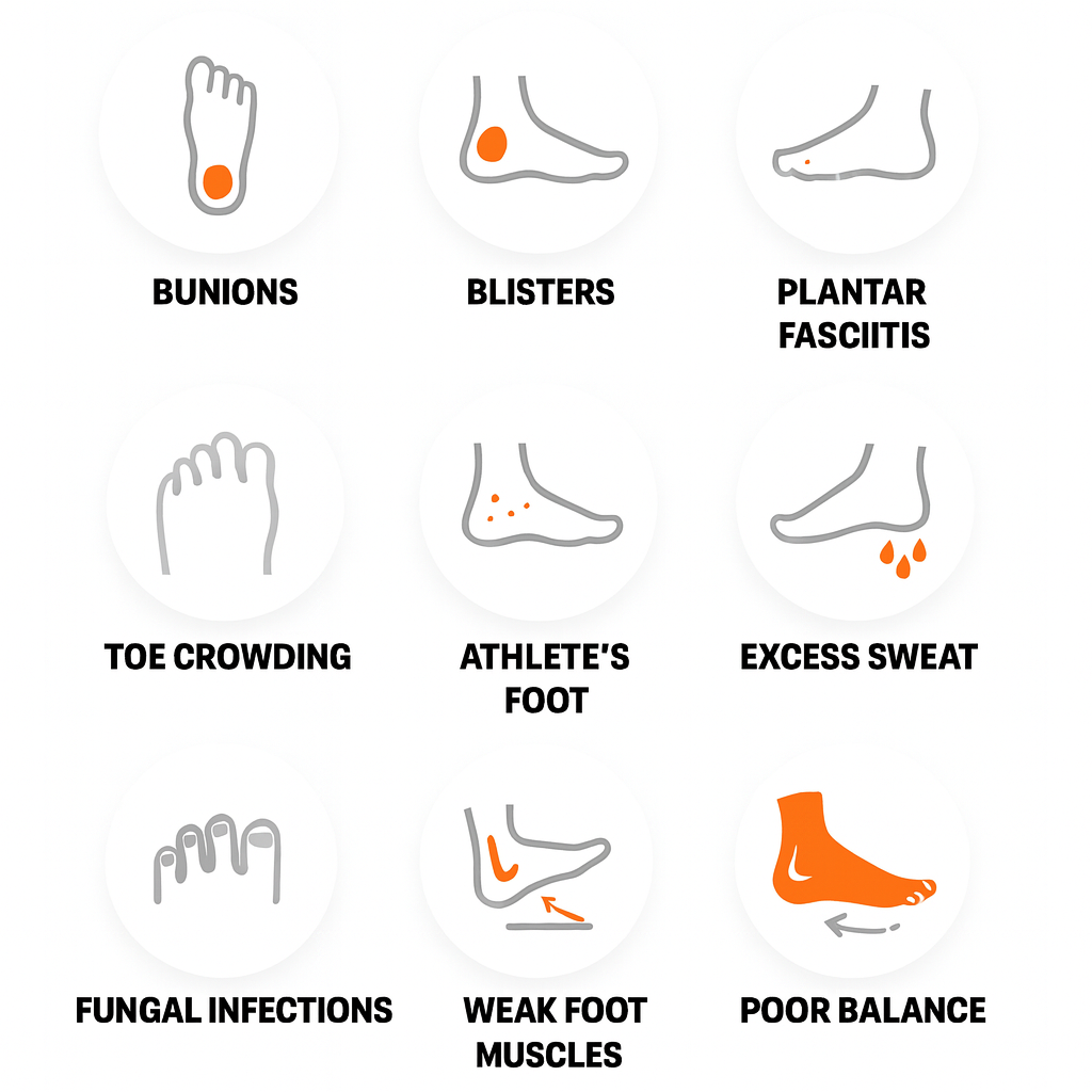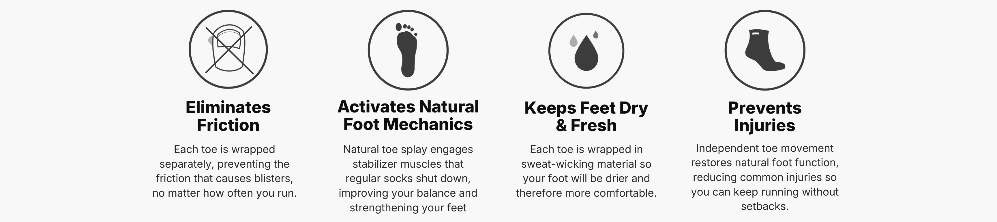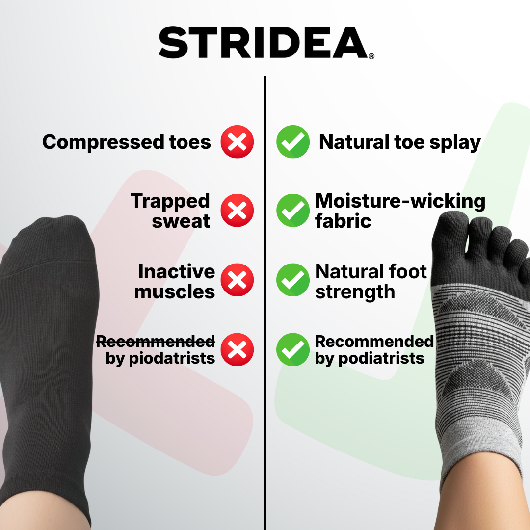 Normale sokken drukken je tenen samen, houden zweet vast en schakelen de spieren uit die je evenwicht bewaren. Dit uit zich in blaren waardoor je je hardlooprondje vroegtijdig moet afbreken, stinkende voeten en pijn waardoor je trainingen overslaat.